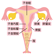 | 子宮 | 腟の奥行きは7〜8cm程度で、その奥に子宮があります。子宮は洋梨をさかさまにしたような形で、出産経験のない女性の場合、鶏卵1個分と同じくらいの大きさです。内側から子宮内膜、子宮筋層、いちばん外側に漿膜(しょうまく)があり、妊娠時には胎児を育てる部屋の役割を果たします。子宮の奥は左右の卵管へとつながっています。 |